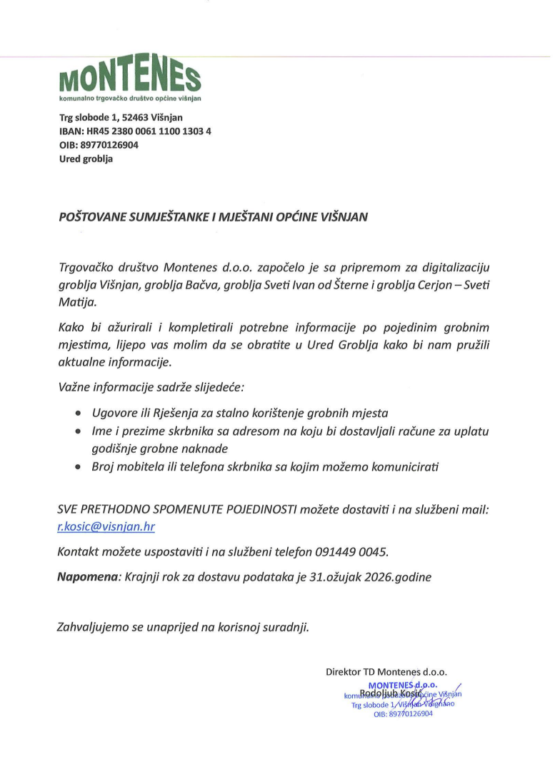Trgovačko društvo Montenes d.o.o. započeo je sa pripremom za digitalizaciju groblja u Općini Višnjan i moli vas za dostavu akutalnih informacija.