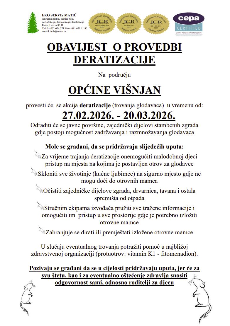 Na području OPĆINE VIŠNJAN provesti će se akcija deratizacije (trovanja glodavaca) u vremenu od: 27.02.2026. – 20.03.2026.