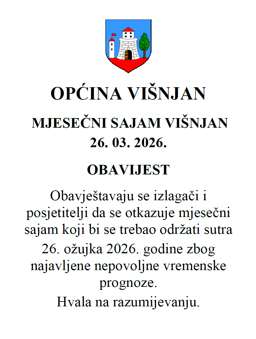 Obavještavaju se izlagači i posjetitelji da se otkazuje mjesečni sajam koji bi se trebao održati sutra 26. ožujka 2026. godine zbog najavljene nepovoljne vremenske prognoze.