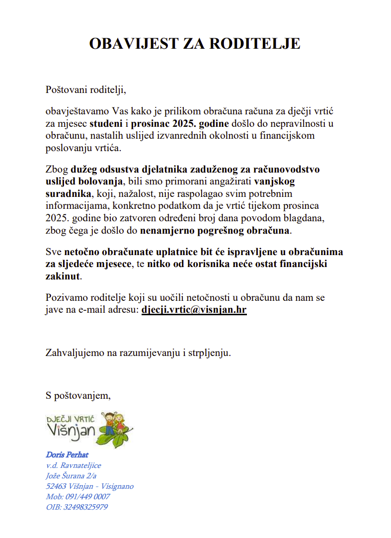 obavještavamo Vas kako je prilikom obračuna računa za dječji vrtić za mjesec studeni i prosinac 2025. godine došlo do nepravilnosti u obračunu, nastalih uslijed izvanrednih okolnosti u financijskom poslovanju vrtića.