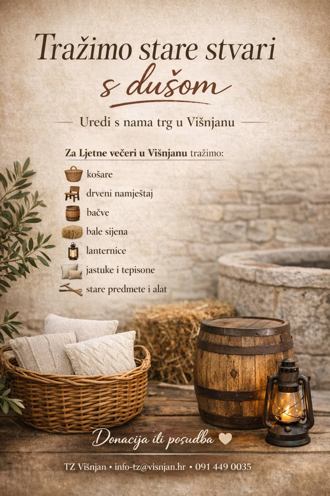 za potrebe uređenja Trga i šterne kod palače Sincich povodom manifestacije Ljetne večeri u Višnjanu, Turistička zajednica Višnjan poziva vas na suradnju.