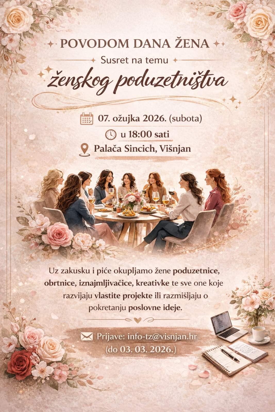 Povodom Dana žena, Turistička zajednica Općine Višnjan organizira susret žena u poduzetništvu koji će se održati u subotu, 7. ožujka 2026. godine u 18:00 sati u Palači Sincich.